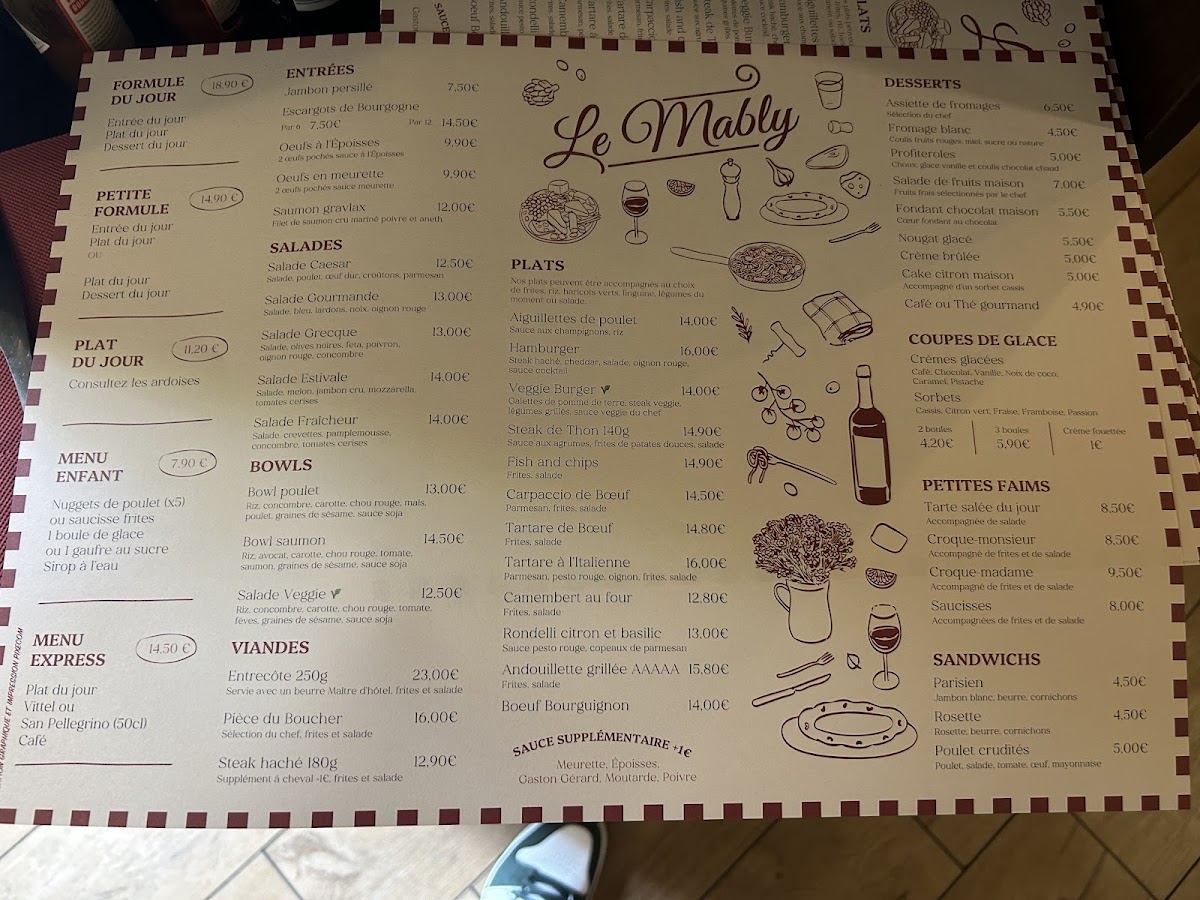 The menu at Brasserie Le Mably feels carefully balanced between classic French brasserie staples and casual, modern comfort dishes, creating a dining experience that is both familiar and approachable. Traditional flavors are well represented with Escargots de Bourgogne, delivering a clear nod to regional heritage, and Andouillette Aaaaa, which stands out for its assertive, authentic character aimed at diners who appreciate rustic French cuisine. Seafood lovers are well served by Cabillaud Au Beurre, a straightforward yet refined dish that emphasizes clean flavors and proper technique. For lighter or fresher options, Goat Cheese Salade Verte and Poke Bowl Poulet offer contrast, appealing to guests looking for balance without sacrificing taste. Cheese plays an important supporting role, whether enjoyed as a dedicated plate of Fromages or through the comforting richness of Camembert Au Four, which highlights indulgence and simplicity. Desserts and drinks complete the menu with equal confidence: Vacherin Glacé provides a refreshing, elegant finish, while Irish Coffee adds warmth and familiarity. The beverage selection, including Une Bière Blonde and Affligem Fruits Rouges, complements the food well and reinforces the relaxed brasserie atmosphere. Heartier options like Turkey contribute to the menu’s versatility, ensuring it caters to a wide range of tastes. Overall, the menu feels cohesive and well-structured, offering something for traditionalists, casual diners, and those seeking lighter, contemporary choices, all while maintaining the identity of a classic French brasserie.